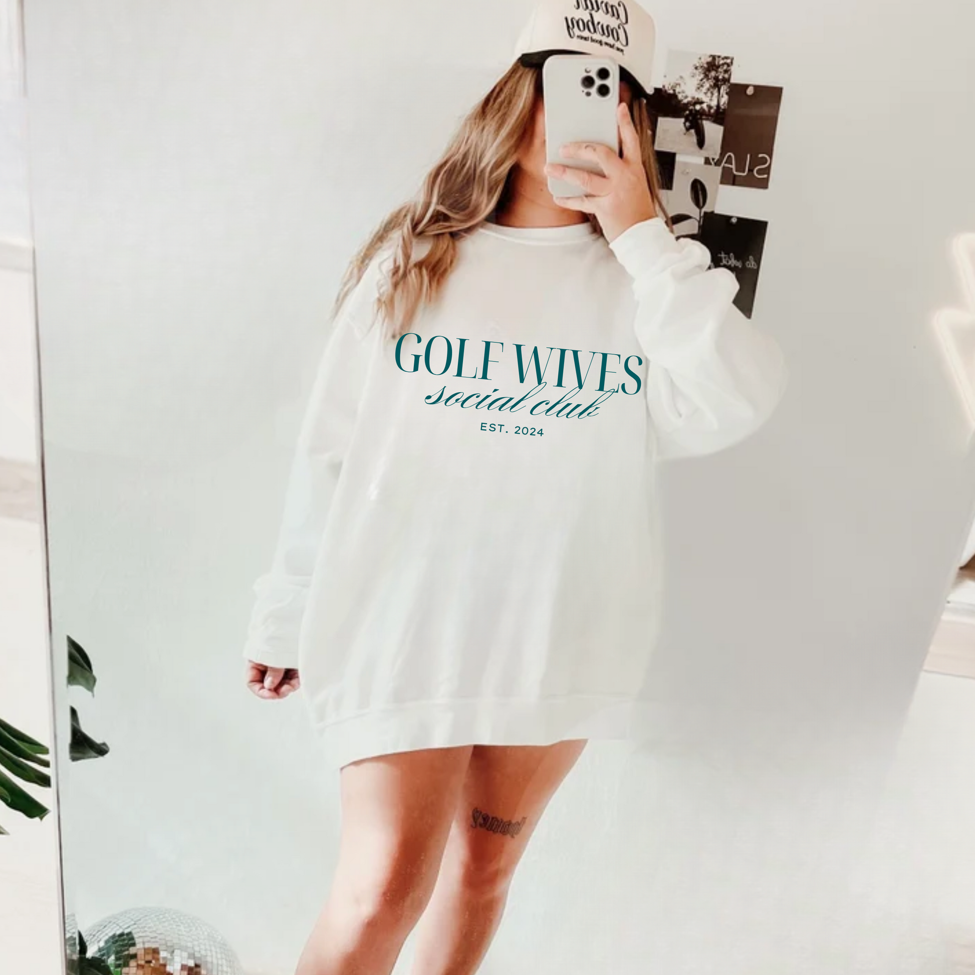 Golf Wives Social Club on our most loved crewneck. Featuring the prettiest teal design on a white sweatshirt for a crisp, clean look.